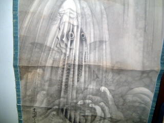 | "Tenjin-Zu" (The image of Tenjin) ■室町時代/土蔵作 ■天神様すなわち、「菅原道真公」の肖像です。束帯姿の公の衣には、膠を混ぜた墨で梅鉢模様が描かれており、なかなか技巧がこらされています。筆者土蔵は室町中期に幕府に属し、相国寺山門の羅漢像の彩色などを行っており、絵仏師として中心的活動をしていました。この図は、貴重な作品として東京教育大学教授赤沢氏により美術雑誌「国華」にも紹介されています。朝日新聞社出版「國華」の1148号7ページにも紹介されています。 |