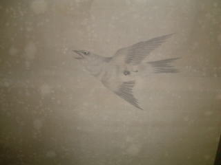 | "Gekka-Hototogisu-Zu" (The image of a little cuckoo under the moon) ■江戸時代/鶴州作 ■月あかりの下をホトトギスが飛来しています。嘴がわずかに開いているので、「テッペンカケタカ」と鳴き声を響かせているのでしょうか。この図は、新城城主菅沼新八郎定志(1821-1855)が大福寺・冨賀寺に参詣したおりにたいへん歓待されそのお礼に贈られたものだということが、軸の裏に貼られた文書から判明しました。定志は絵画・茶道をたしなんだ風流人で、彼の作品は三原屋さんにも残されています。 |