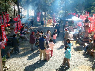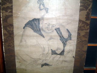 | "Hotei-Zu" (The image of Hotei God) ■室町時代/作者不明 ■太鼓腹をつきだして大きなずだ袋に布袋様が寄り掛かっています。室町時代後期の狩野派の影響が見受けられます。ところどころに補修のあとがありますが、貴重な作品として大切にされていたことが推測されます。 |