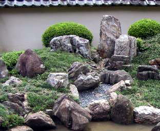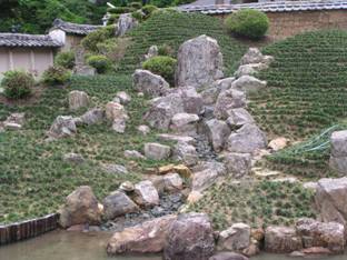 | ■江戸時代初期 正面に三尊石を配し、なだらかな築山と、木杭で区切られた水辺の線が全体として優雅な趣をあらわしています。枯れ滝の石組みが特に美しく、日本庭園研究会の吉河功氏が推賞されています。 |