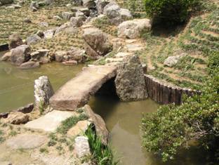 ■出島護岸石組/石橋/飛び石![]() 滝石の手前にある出島は、滝を生かす遠近法としての効果を持っており、その護岸石組みの造形にも優れた感覚が見られます。特に、滝の流れが池に落ちる滝口の部分に組まれた最大幅105センチの横石は、右から左に力強く突き出しており、この一石が本庭の一つの特徴となっています。それに続く石組みも、さりげない表現ですが「摩訶耶寺庭園」の護岸石組みを彷彿とさせるものがあり、本庭の質の高さがよく表れています。本庭池泉の東北部の石橋は、元の板橋に替えて架けられた、長さ168センチの半加工の反り橋です。反り橋の先に続く飛び石が発見されましたが、これは庭園を回遊する為のものでなく、不動の滝を間近に拝するために作られたものです。 ■枯れ滝石組本庭南部西岸に組まれた枯滝は、古庭園中の枯滝とし |