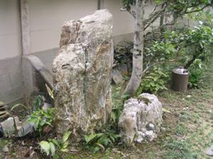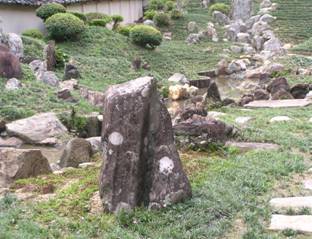 | ■亀島と岩 南部中央に横たわる亀島と岩島は、その造形に江戸初期の強さが失われ、写実的傾向が出ていることから、おそらく江戸末期の寛政年間に加えられたものと思われます。背中の亀甲石や、手前の亀脚石の存在が、その写実性を高めています。亀頭石は、一見立石風ですが、その下幅が広いために、本来の頭を持ち上げた表現が散漫になっています。また偶然にも、石に付いた傷が目のように見え、羊か豚のように見えてしまうのも不思議です。亀頭石前の南にある岩島は、一種の蓬莱岩島表現です。江戸初期頃にはかなりの庭園に例を見られますが、その多くは立石で、本庭のような横石の作は希少です。この特殊な石組造形は、その石材に起因していると思われます。使われた石材はほとんど地元の「雨生山石」(うぶざんせき)で、静岡県との県境に連なる山で採れる硬質の青石です。表面に赤錆色のものが多く、奇岩怪石ふうのものと、水に削られ滑らかになったもとがあります。客殿前の中央部池泉の東岸と亀島は、ほとんどが「雨生山石」を使用しており、その組み方も本庭北部の江戸初期の石組みとは異なります。この部分は江戸末期に改造されたものと思われます。 ■庭門付近の石組み